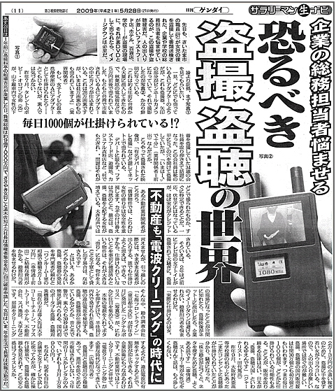 日刊ゲンダイ特集記事![]() ※日刊ゲンダイの特集以外にも、電波クリーニングに関しての取材申し込みが増加していることから、盗聴盗撮犯罪に対する世間的注目度の高さが伺えます。 |